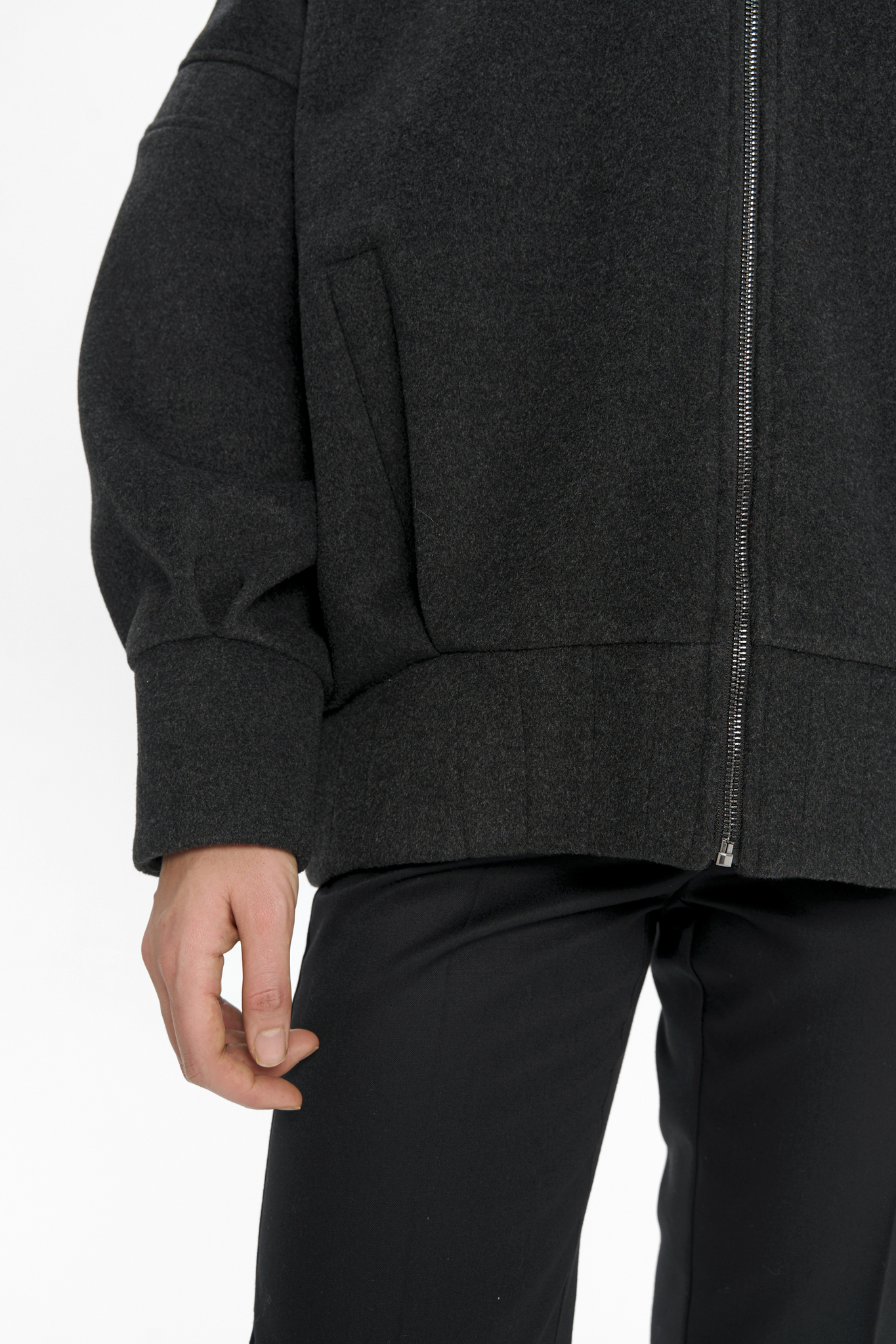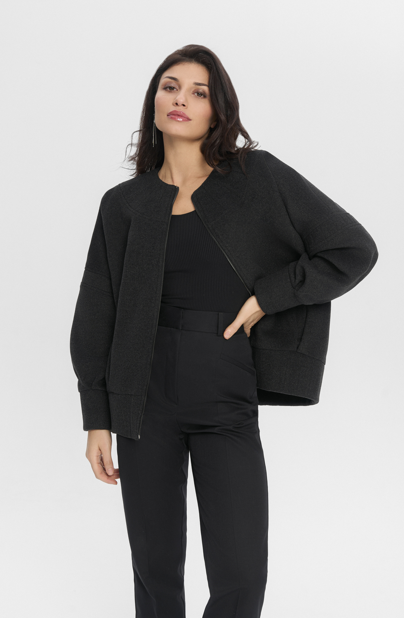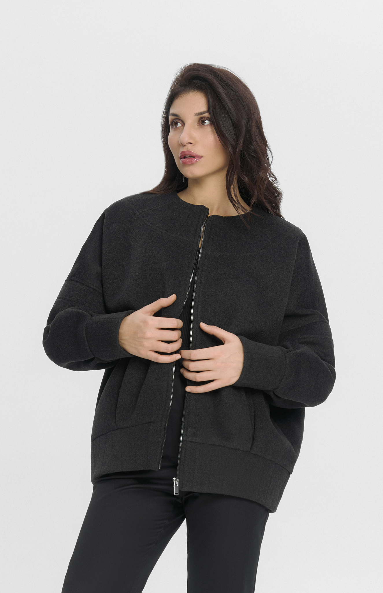 Мягкая шерстяная ткань с плотной текстурой обеспечивает комфорт, а прямой крой и аккуратная молния спереди делают бомбер функциональным и стильным. Он прекрасно сочетается с брюками, джинсами или юбками, позволяя создавать образы в стиле casual или smart-casual.
