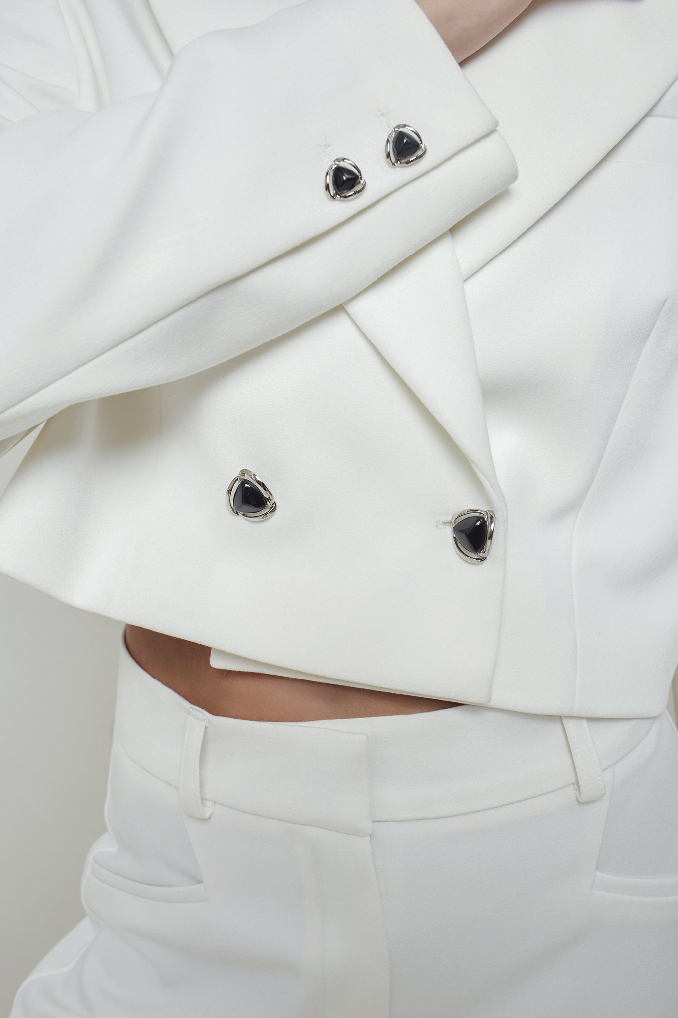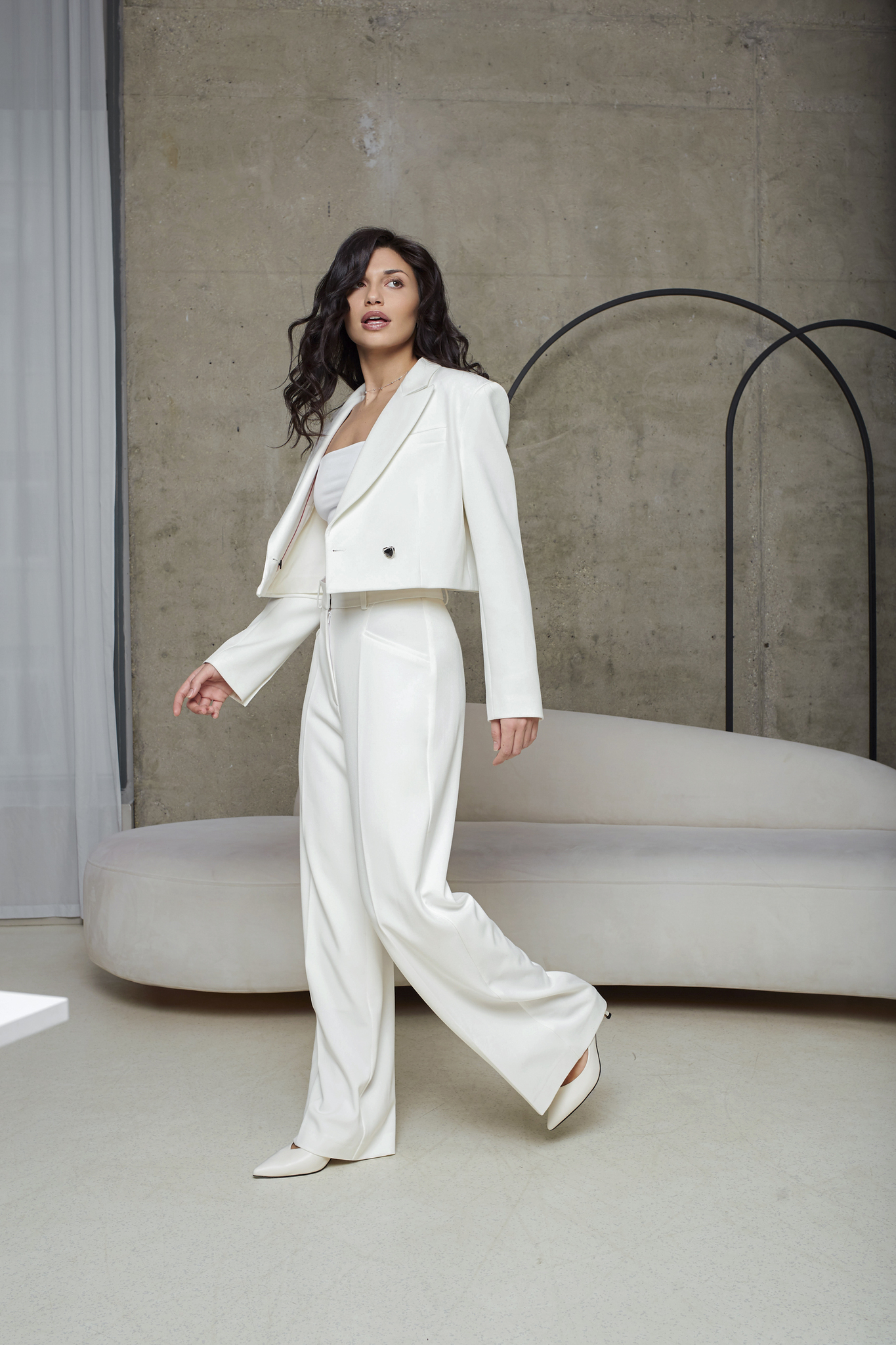 Кроп-жакет Biancelle — кроп-жакет в минималистичном стиле, подчёркивающий талию и создающий чёткий, современный силуэт благодаря широкой линии плеч. Изготовлен из тактильно приятного костюмного материала. Он прекрасно держит форму и мягко ложится на фигуру. Английский воротник и застёжка на две пуговицы делают образ универсальным: носите с брюками, джинсами или платьем. Цвет айвори освежает любой аутфит, а лаконичный крой позволяет легко комбинировать кроп-жакет Biancelle в офисе и на вечерних встречах, а оранжевый кант подклада во внутренней стороне добавляет