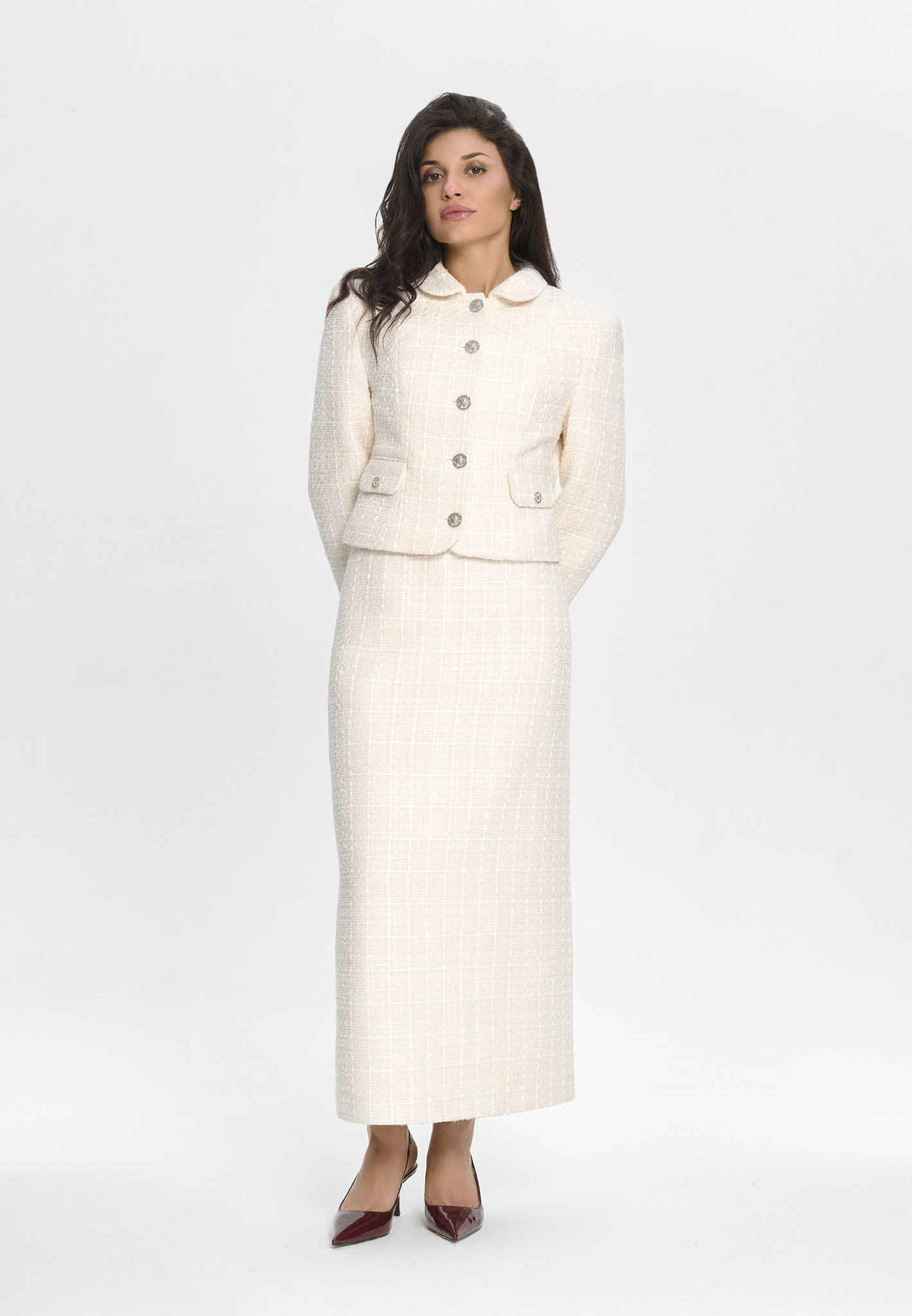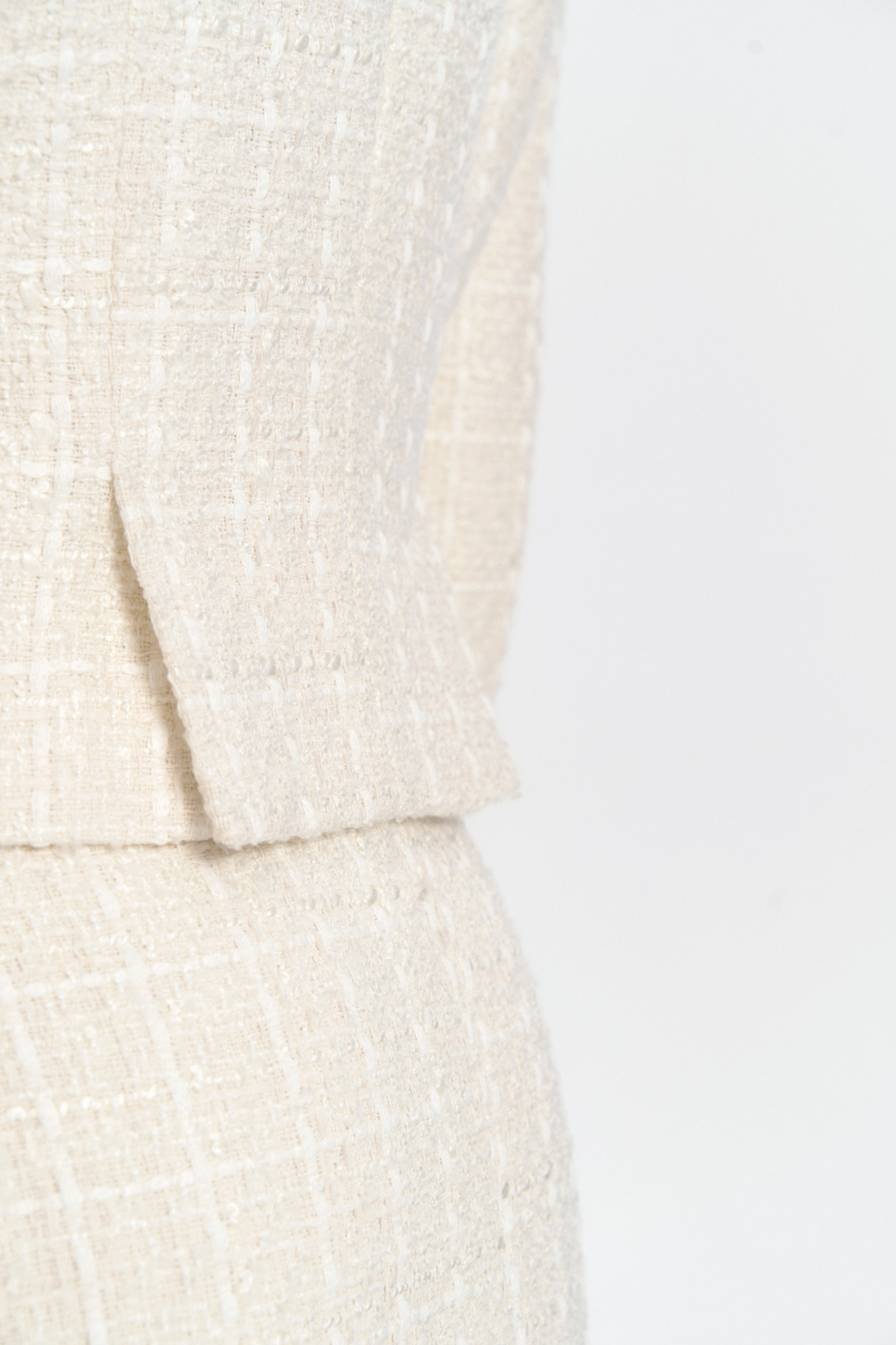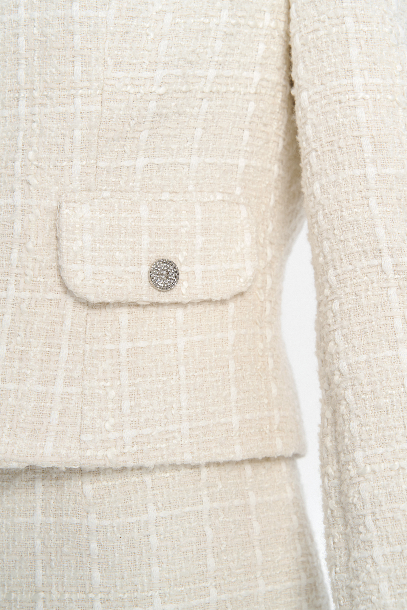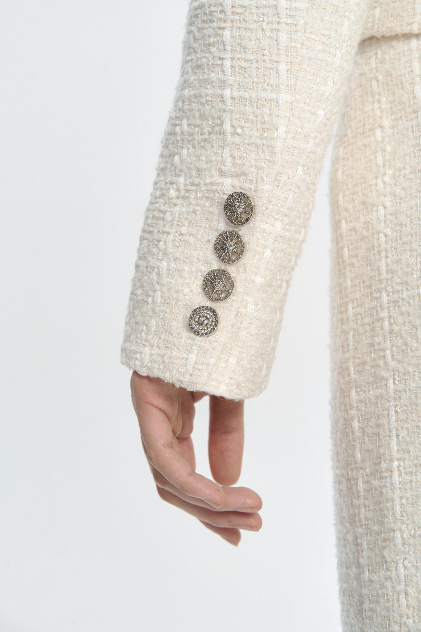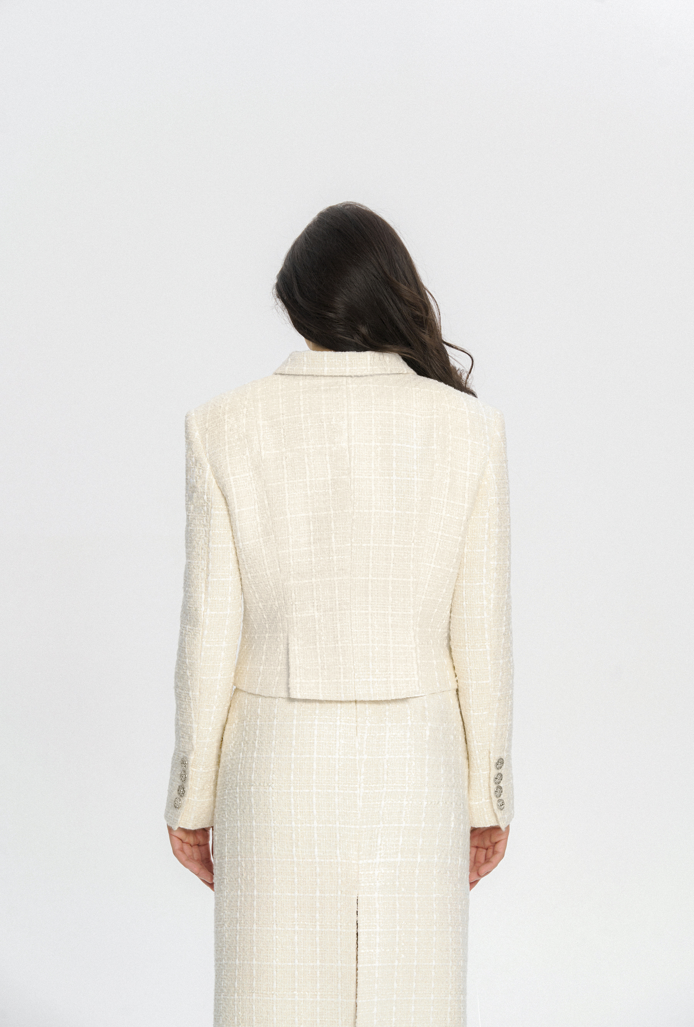 Жакет Céleste — изящная модель в светлом оттенке айвори, созданная в духе утончённой классики. Аккуратный прямой крой, фактурная ткань с деликатной клеткой и изысканные пуговицы придают образу благородство и лёгкость. Выполненный из легкого фактурного твида, жакет сочетает в себе современную текстуру и минималистичный шик. Аккуратная необычная шлица на спине придает дополнительного шарма и игривого настроения для классической модели.