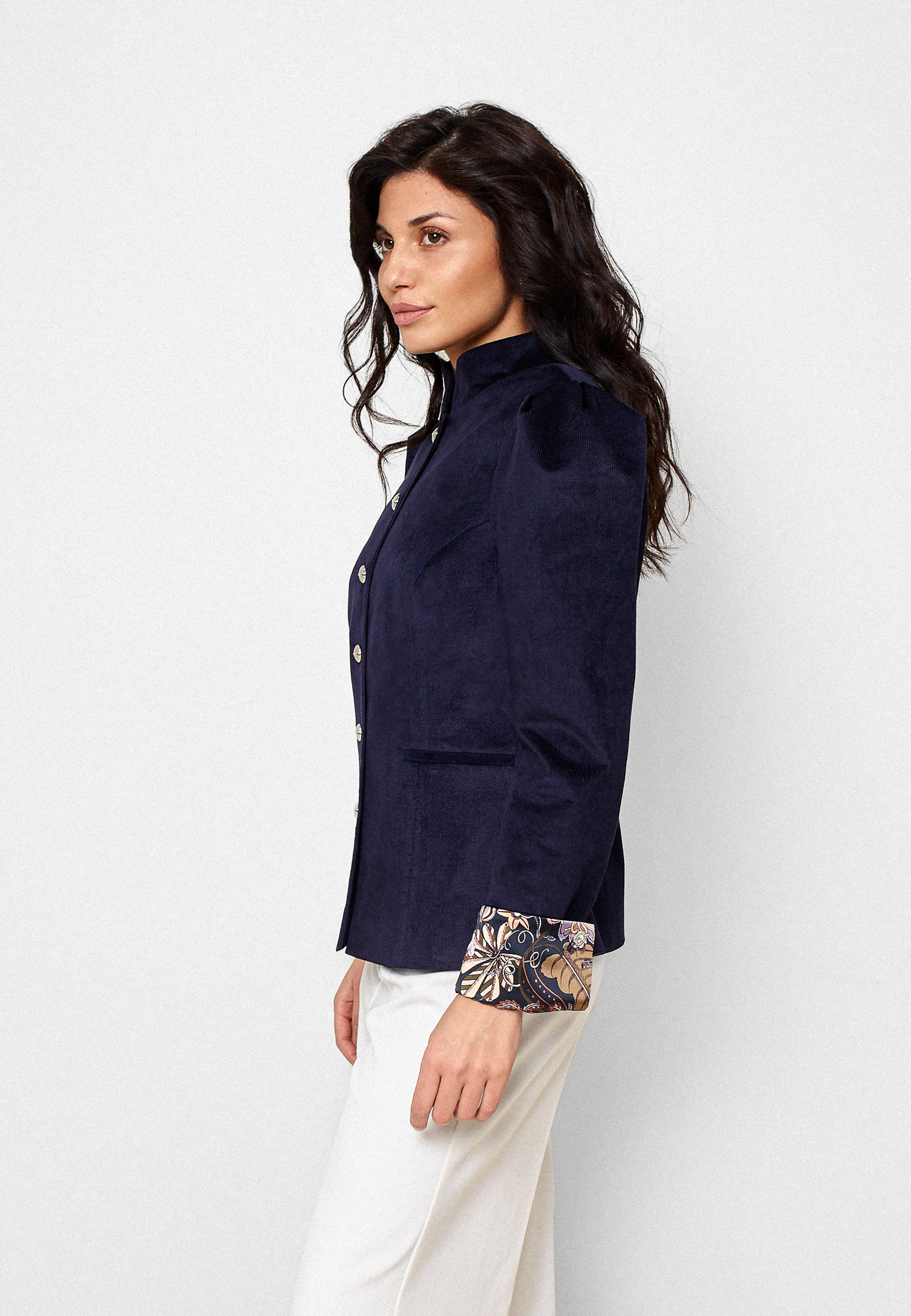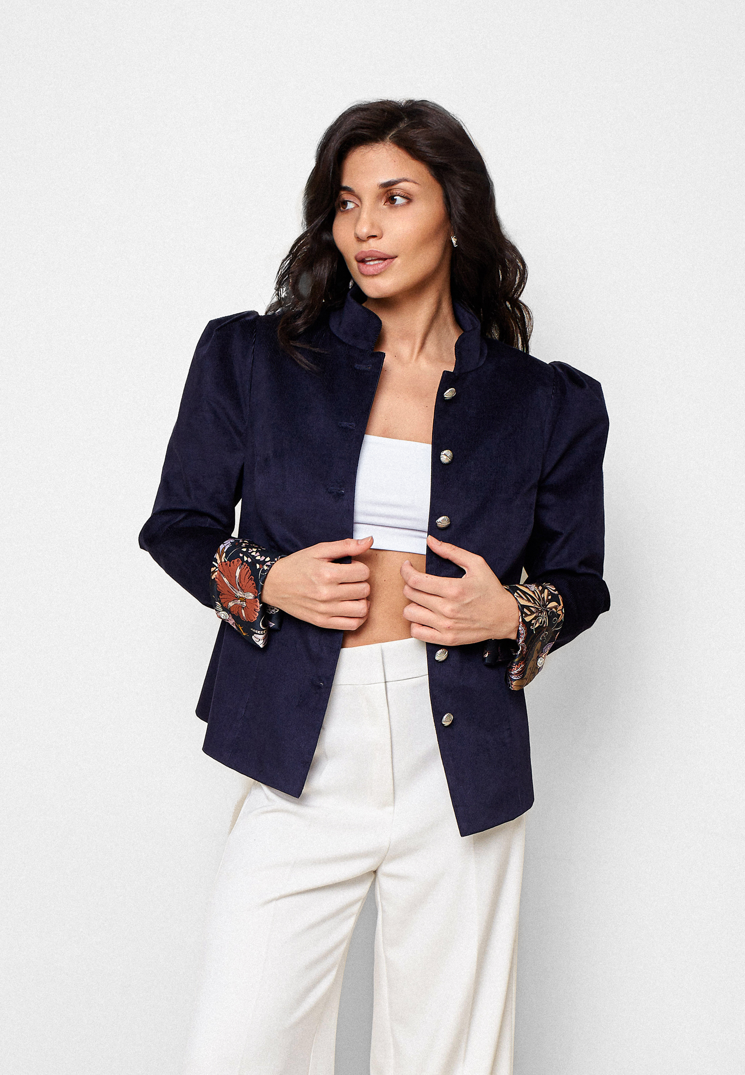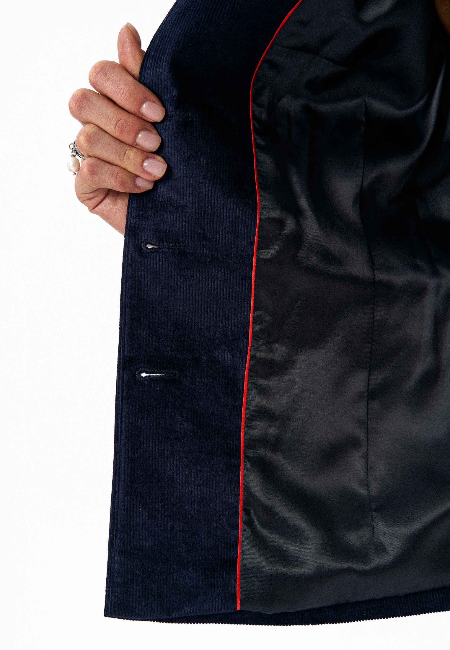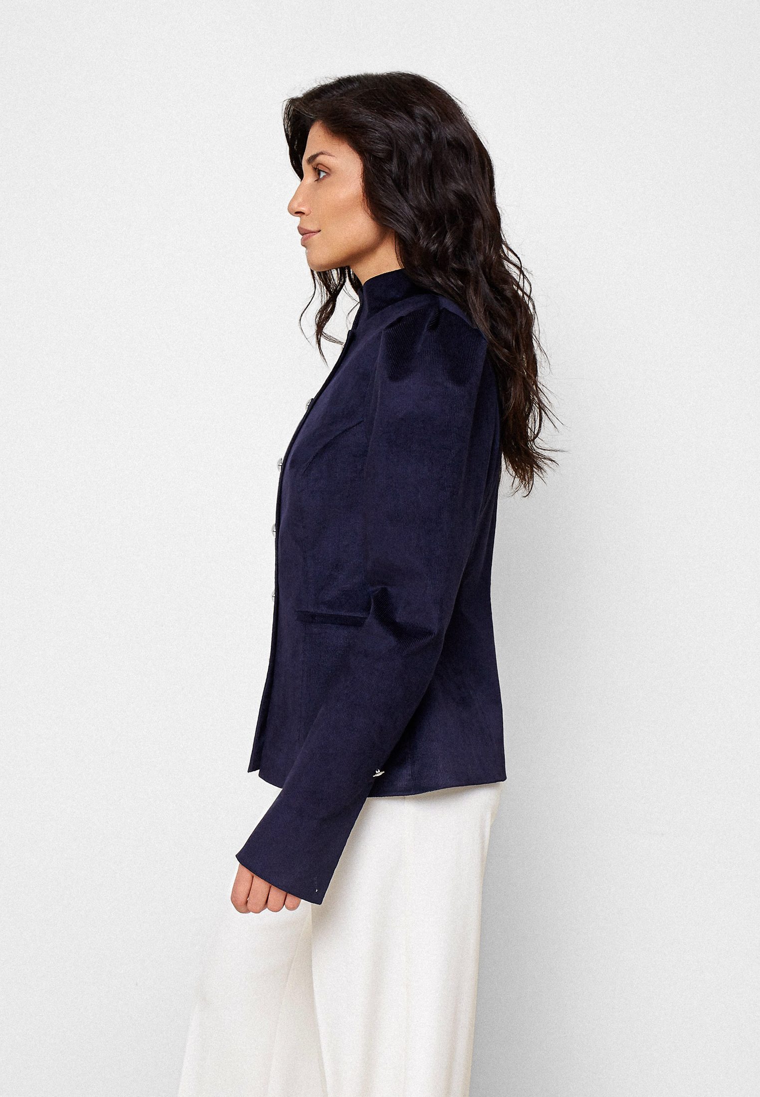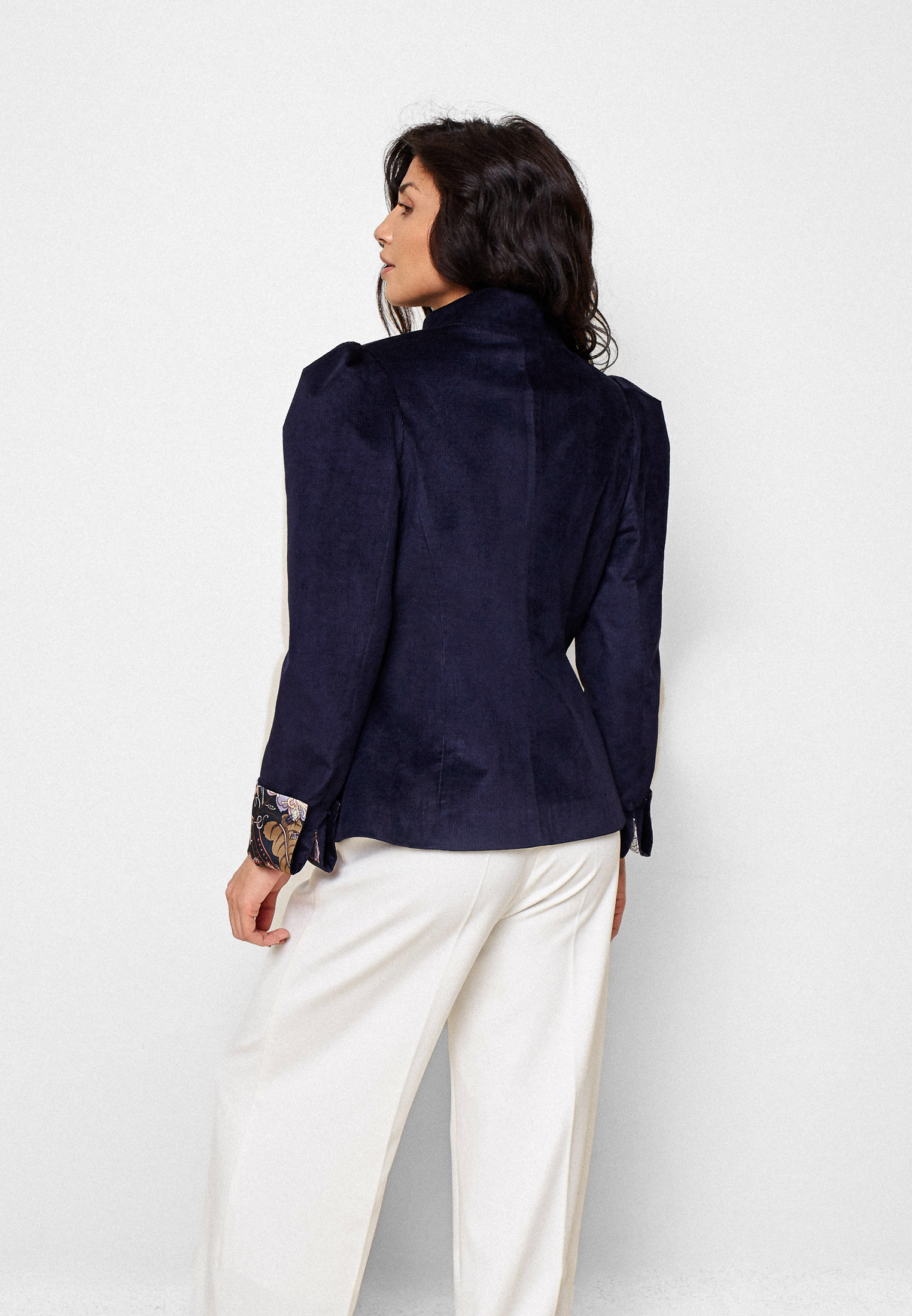 Жакет Avelisse — жакет, в котором соединяются строгость силуэта и утончённая женственность. Выполнен из тёмно-синего итальянского вельвета с рукавами из английского шелка. Он напоминает вечерний воздух — прохладный, глубокий, но мягкий на ощупь. Прямой крой с подчёркнутыми плечами создаёт статный образ, а застёжка на фигурные пуговицы-запонки придаёт жакету благородную сдержанность.