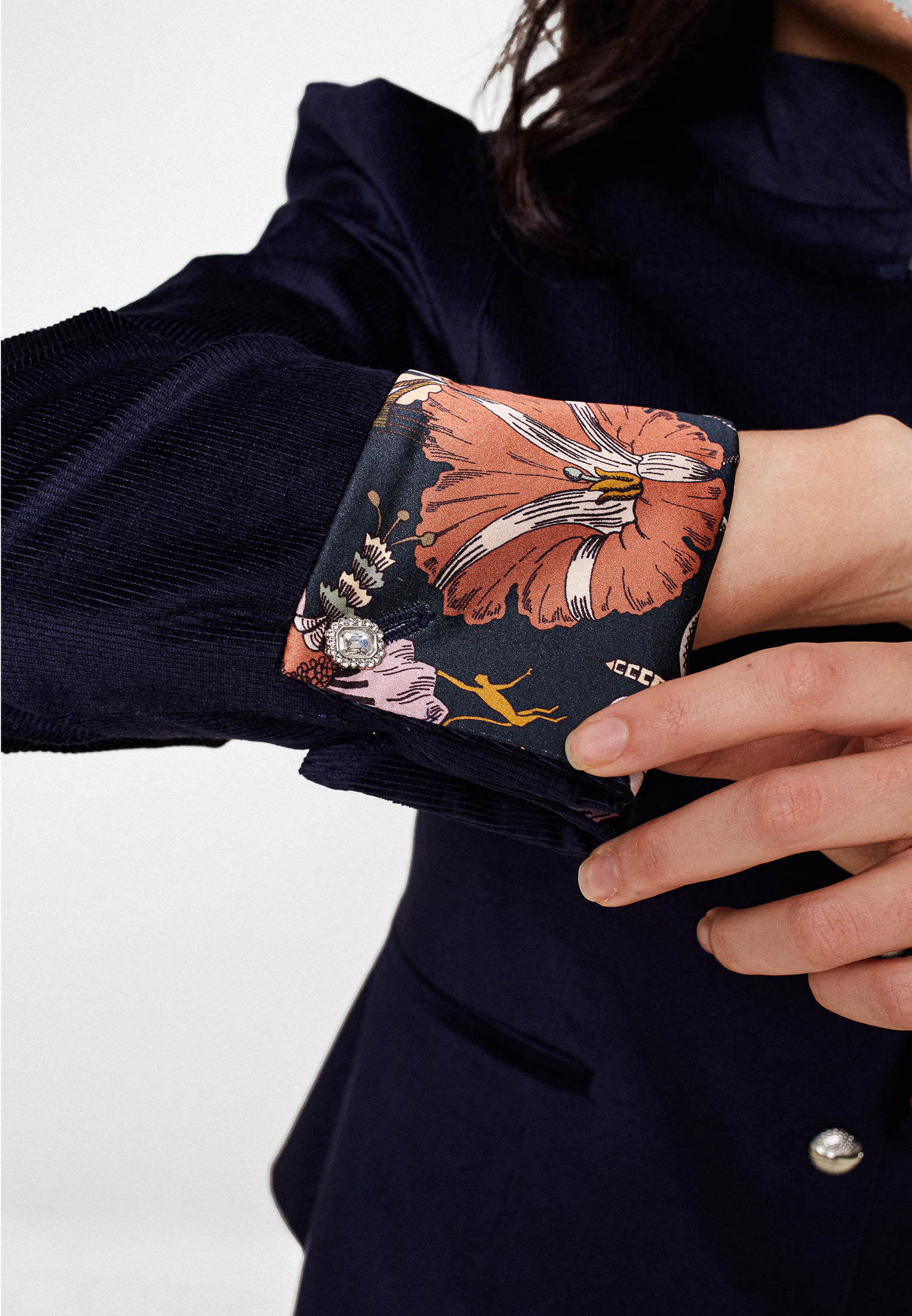 Внутренний подклад на рукавах из 100% натурального английского шелка с цветочным принтом остаётся почти незаметной, но значимой деталью — как личное воспоминание, скрытое от чужих глаз.