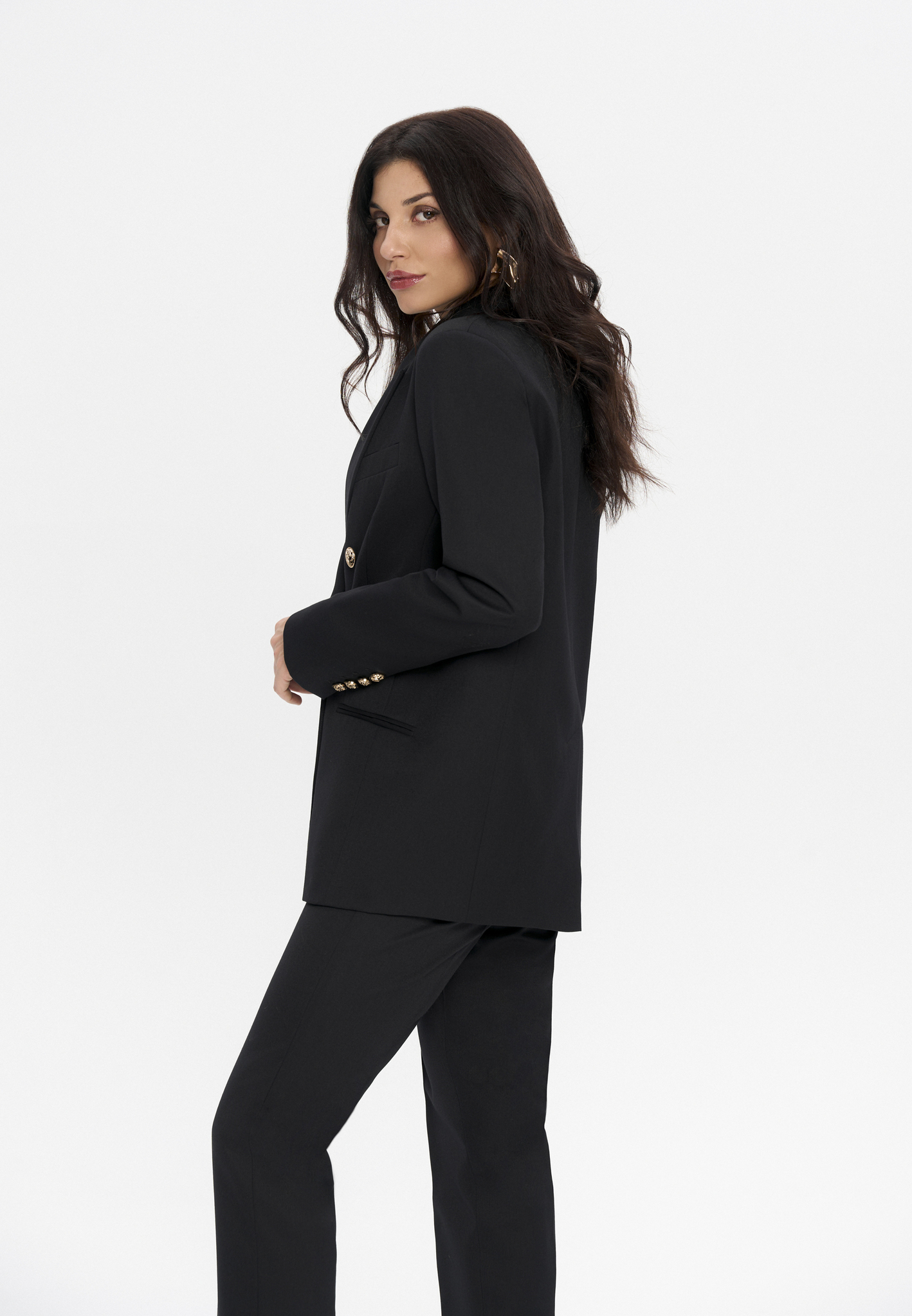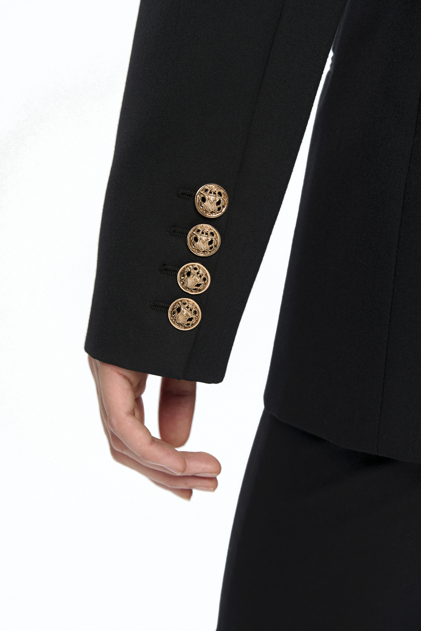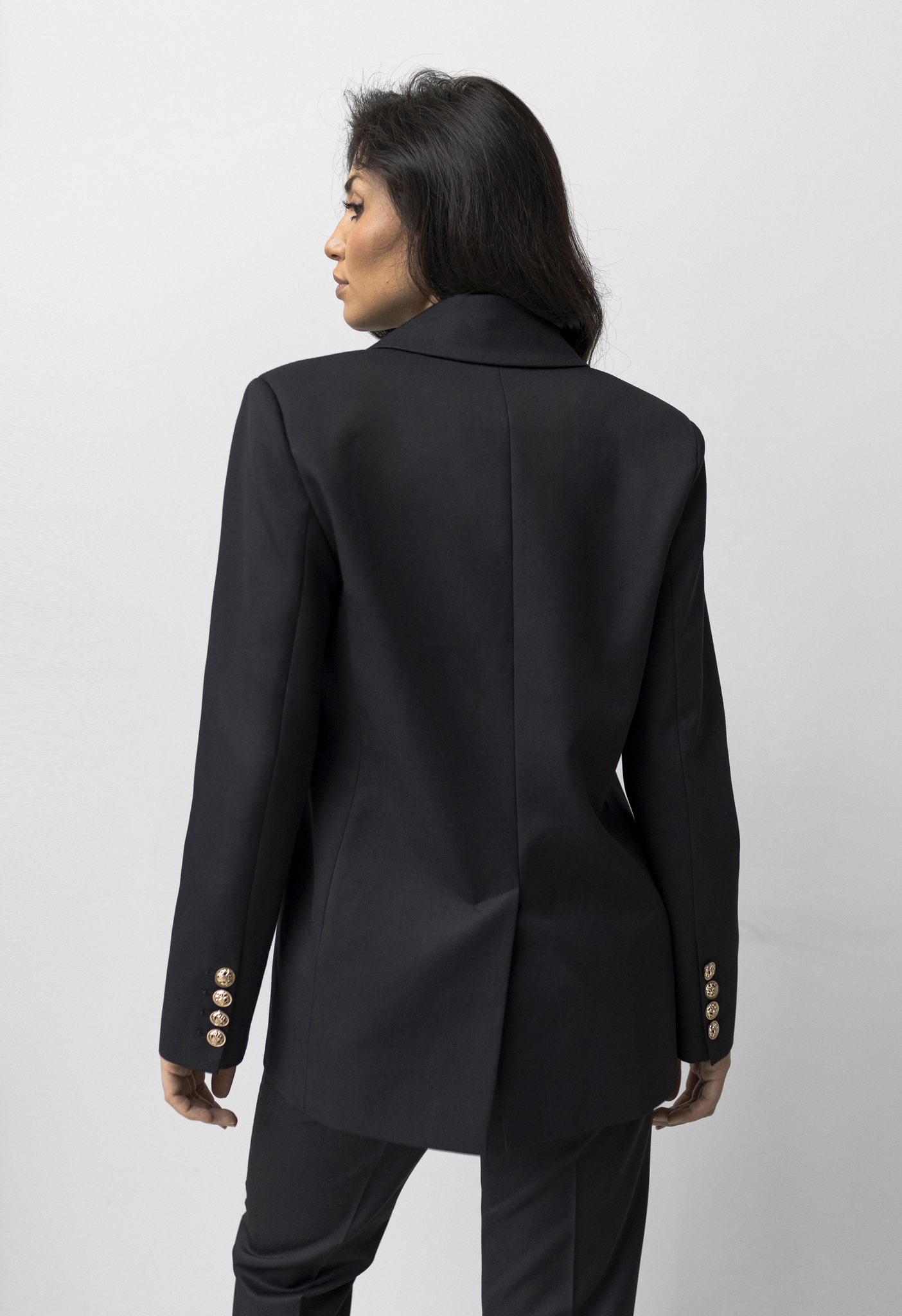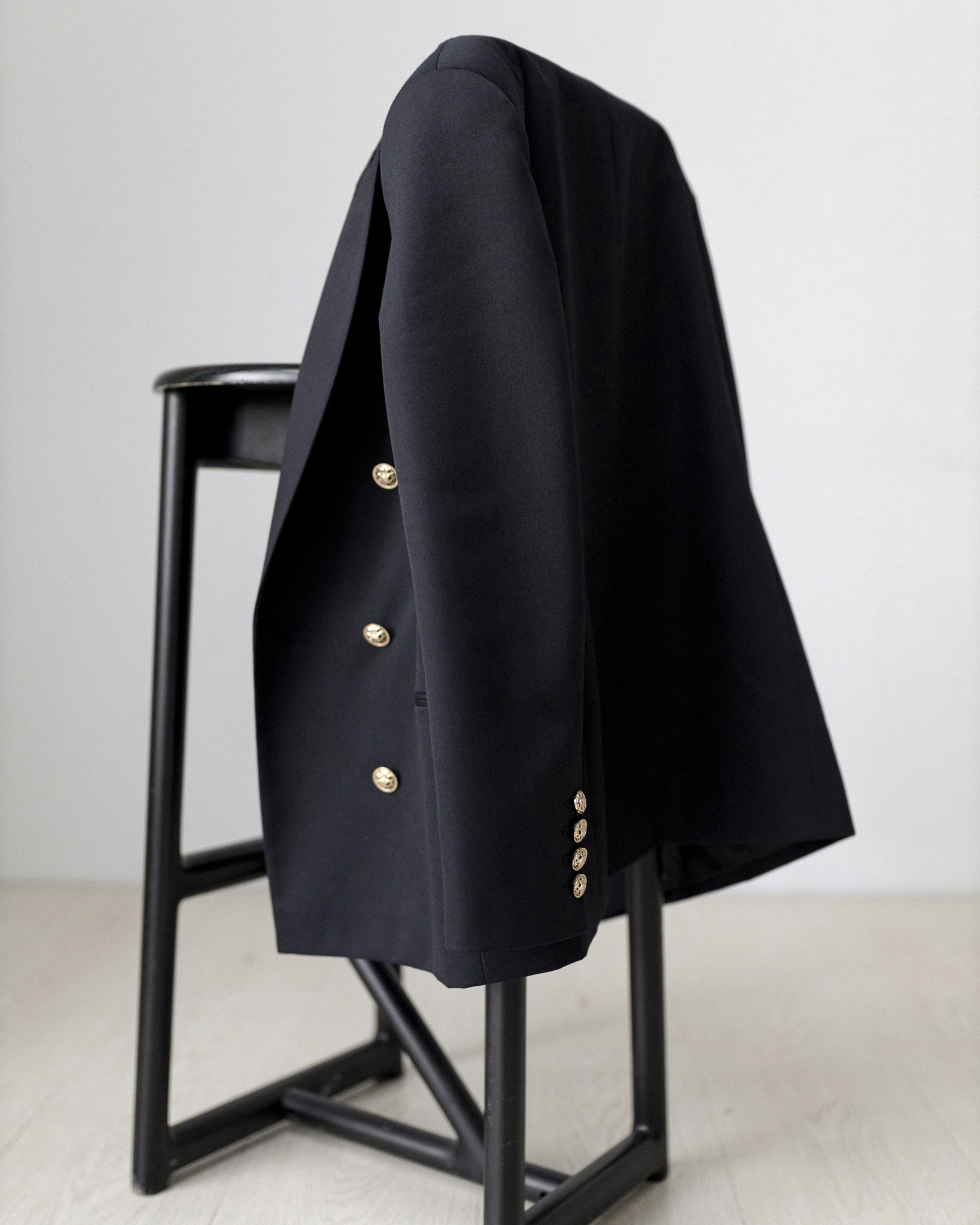 Жакет Emperra — флагманская модель BlackJaque, отражающая его суть: утончённость формы, уверенность в каждом движении и культ безупречного качества. Глубокий чёрный цвет, авторские лацканы строгого кроя и сияние золотистых пуговиц складываются в силуэт, рождающий ощущение внутренней власти и собранной элегантности.