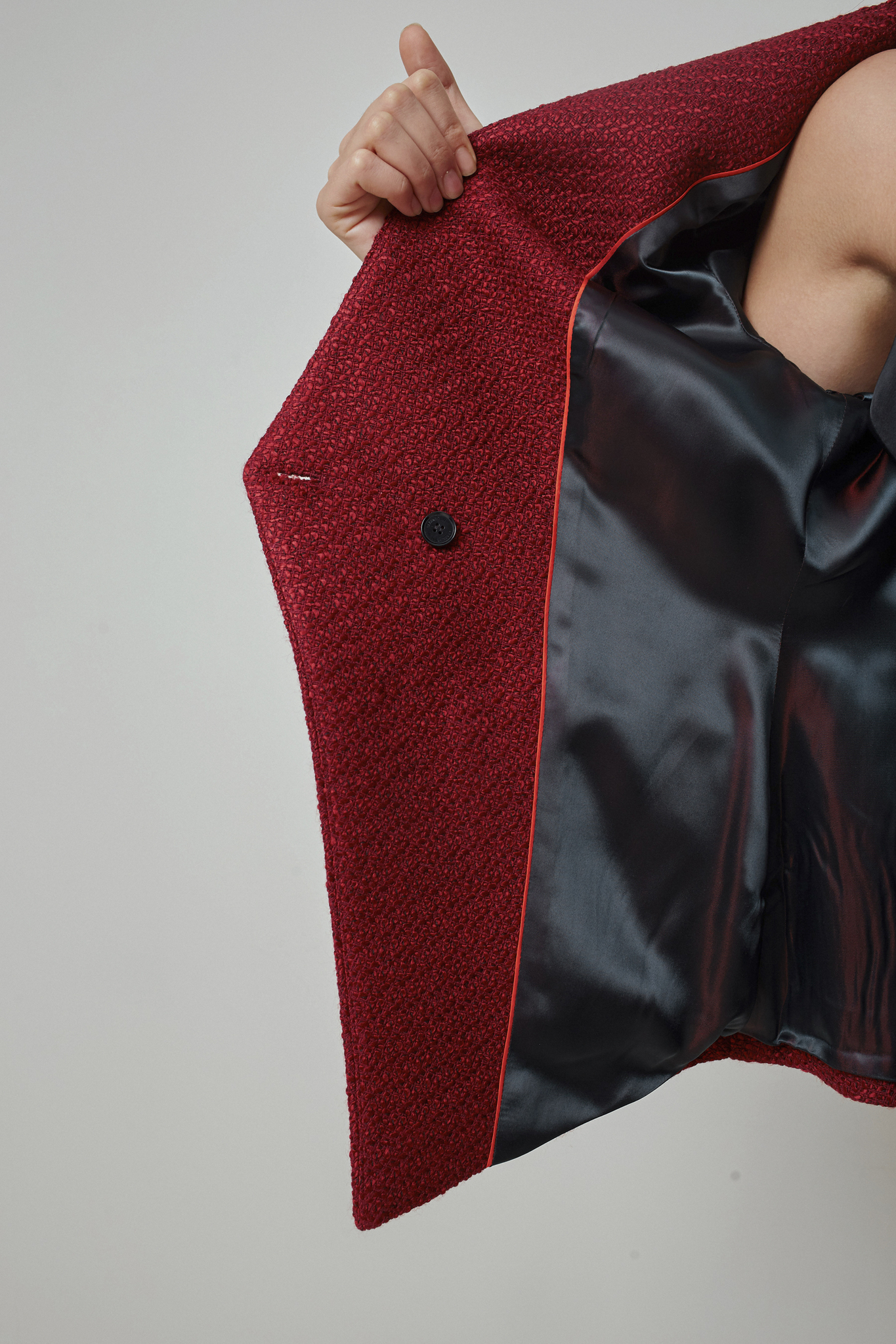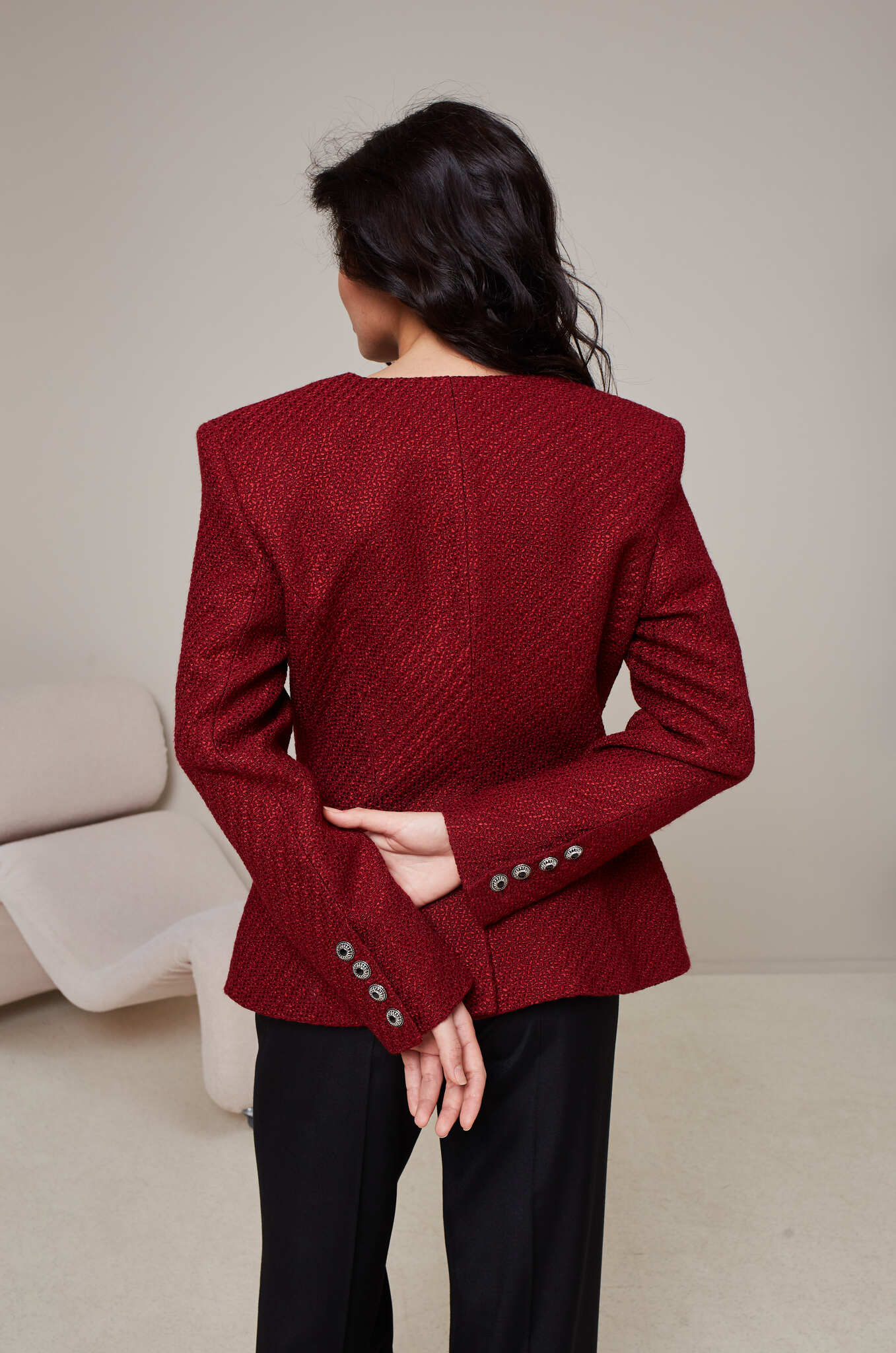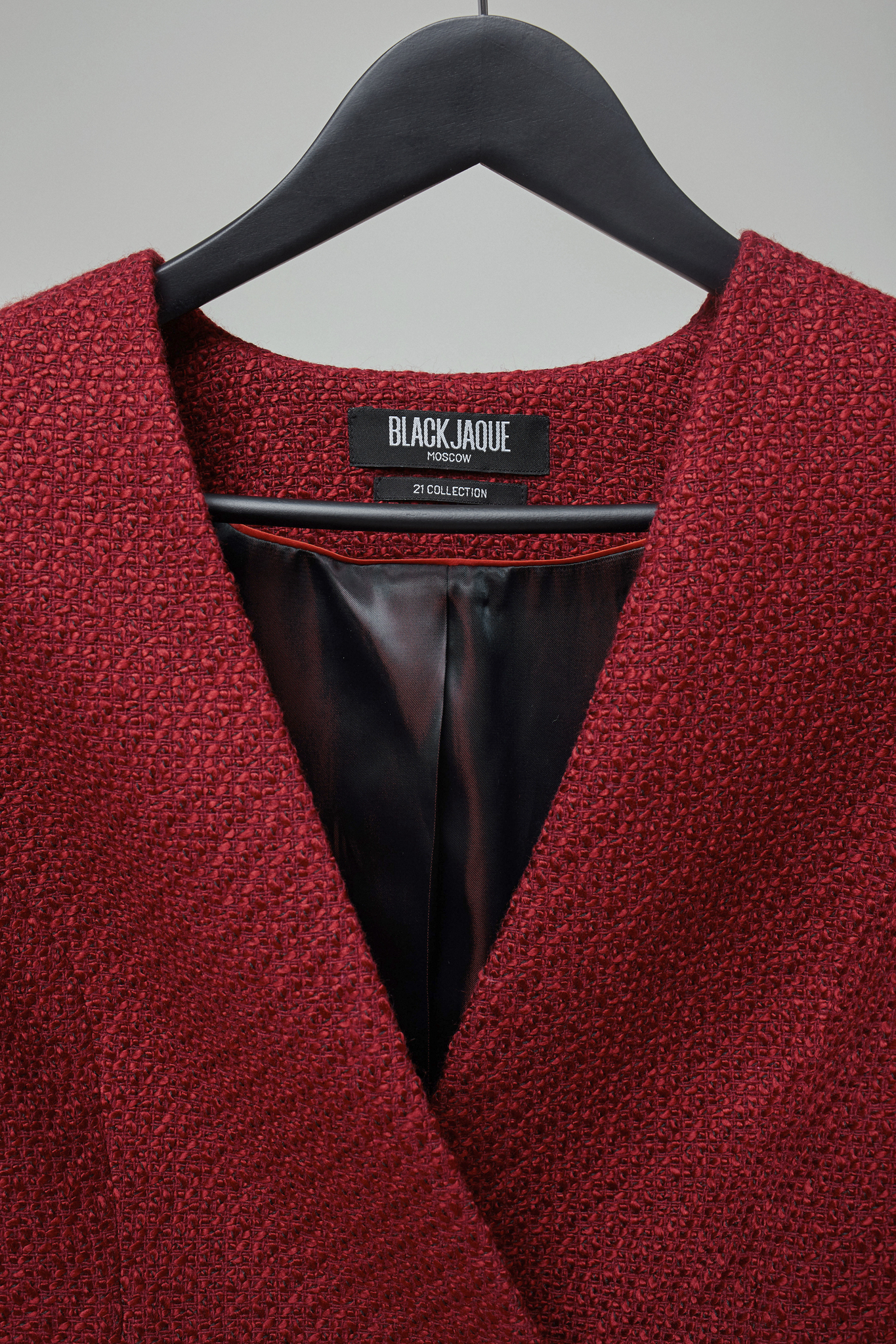 Жакет Flamina — приталенный двубортный ассиметричный жакет в насыщенном карминном оттенке. Ткань мягко держит форму и приобретает утончённый блеск при движении. Рельефные швы и акцентная небольшая баска по талии подчёркивают силуэт, а двуцветный подклад из вискозы и кант фирменного цвета добавляет изделию внутреннего свечения.