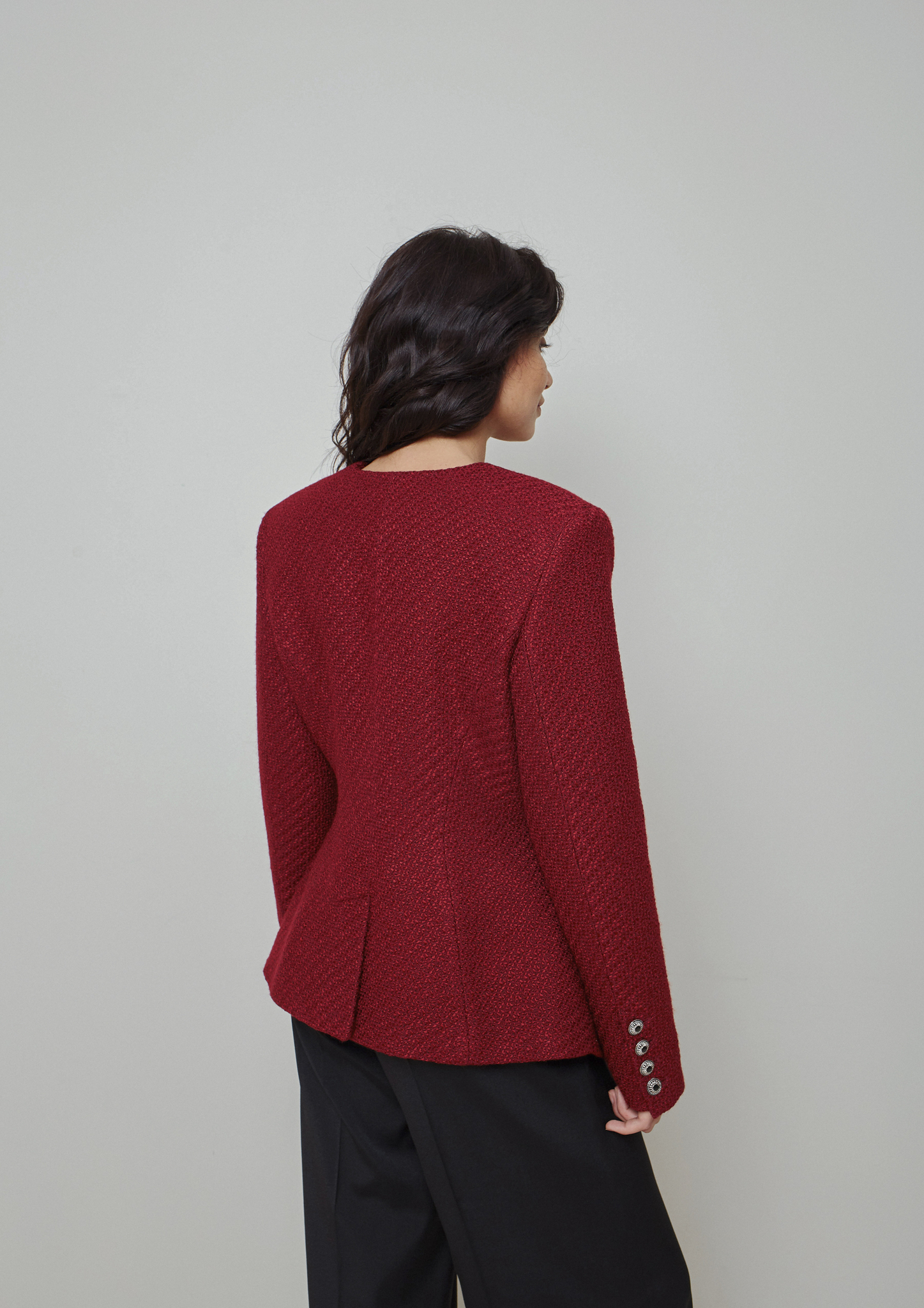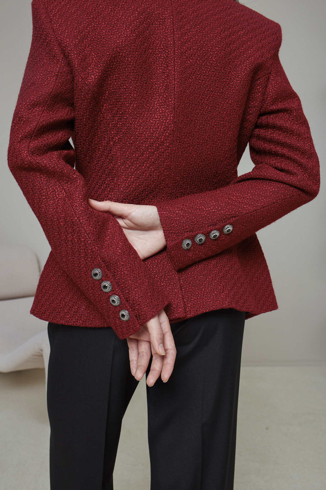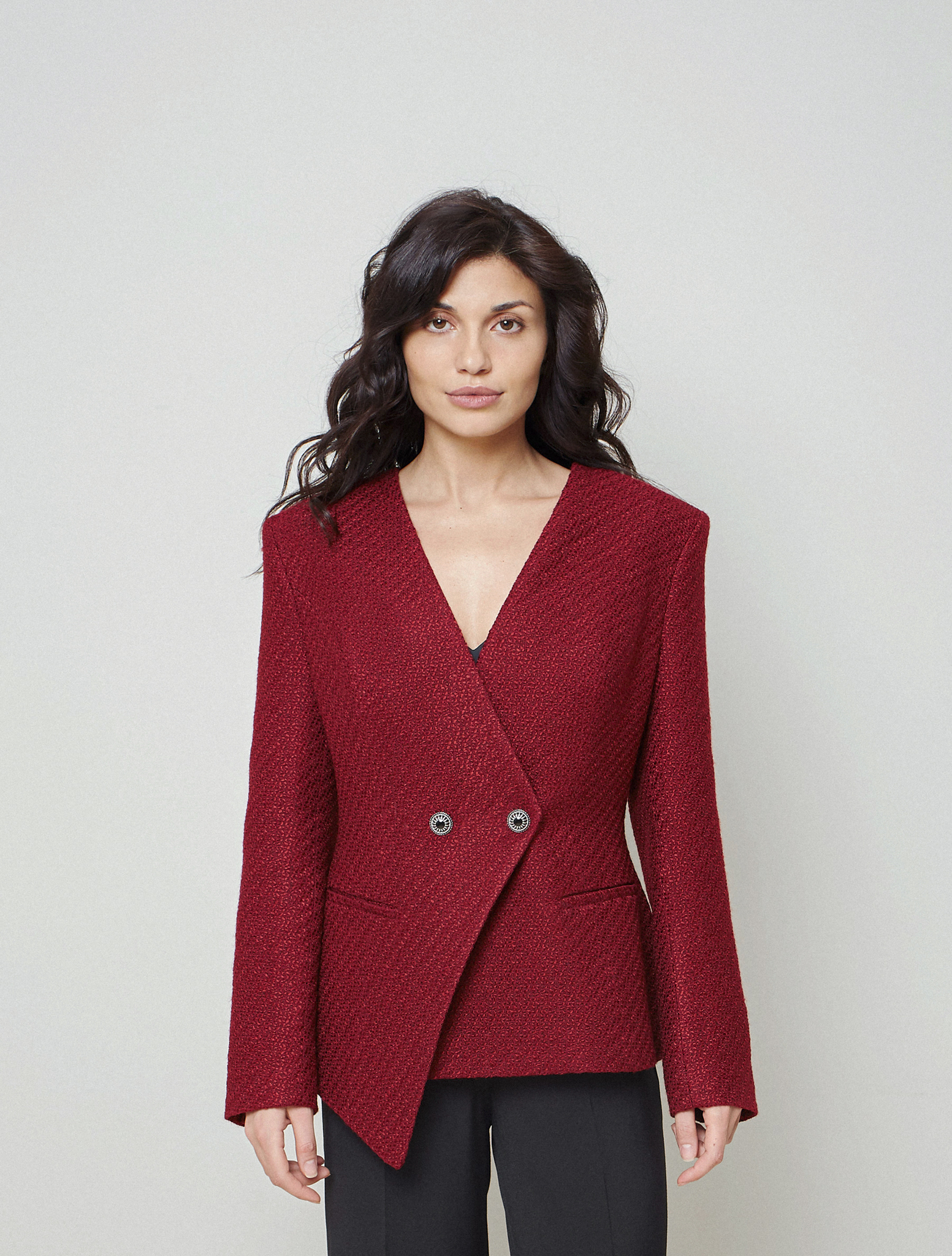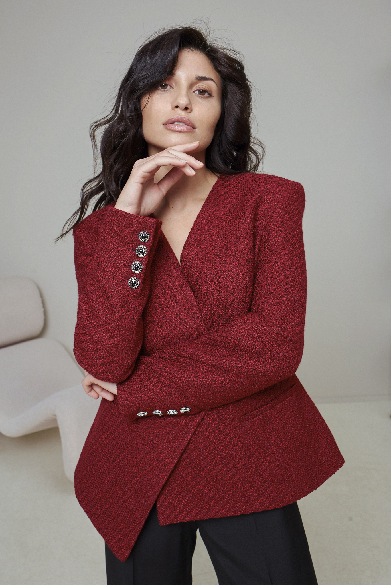 Жакет Flamina — приталенный двубортный ассиметричный жакет в насыщенном карминном оттенке. Ткань мягко держит форму и приобретает утончённый блеск при движении. Рельефные швы и акцентная небольшая баска по талии подчёркивают силуэт, а двуцветный подклад из вискозы и кант фирменного цвета добавляет изделию внутреннего свечения.