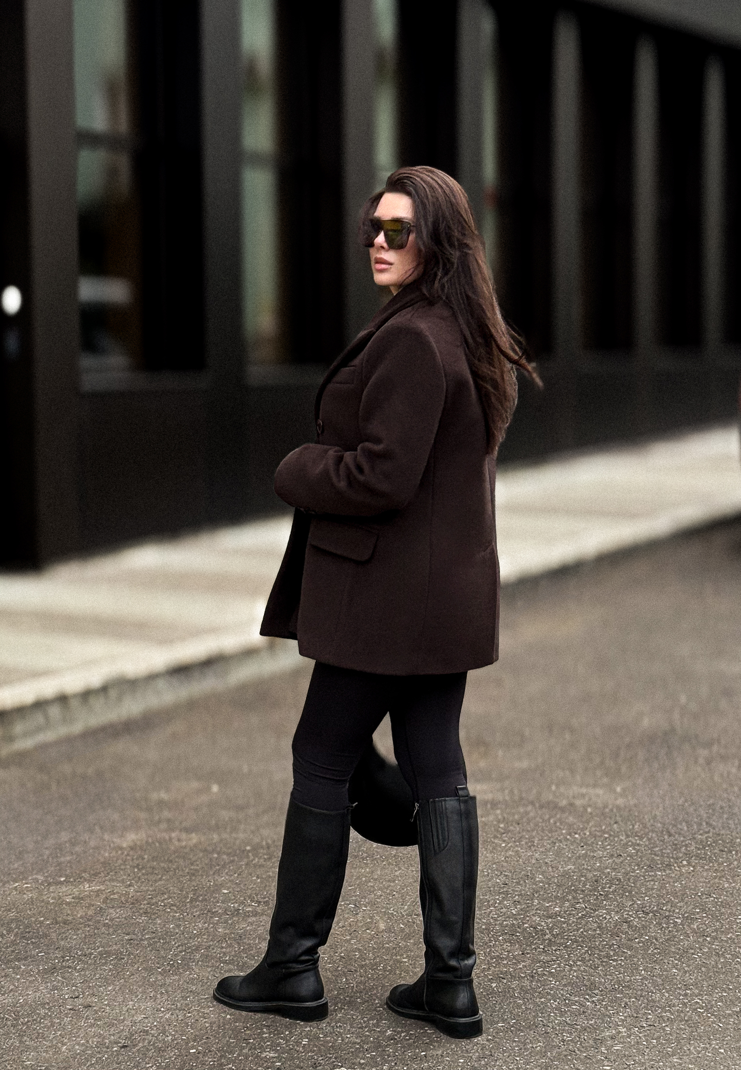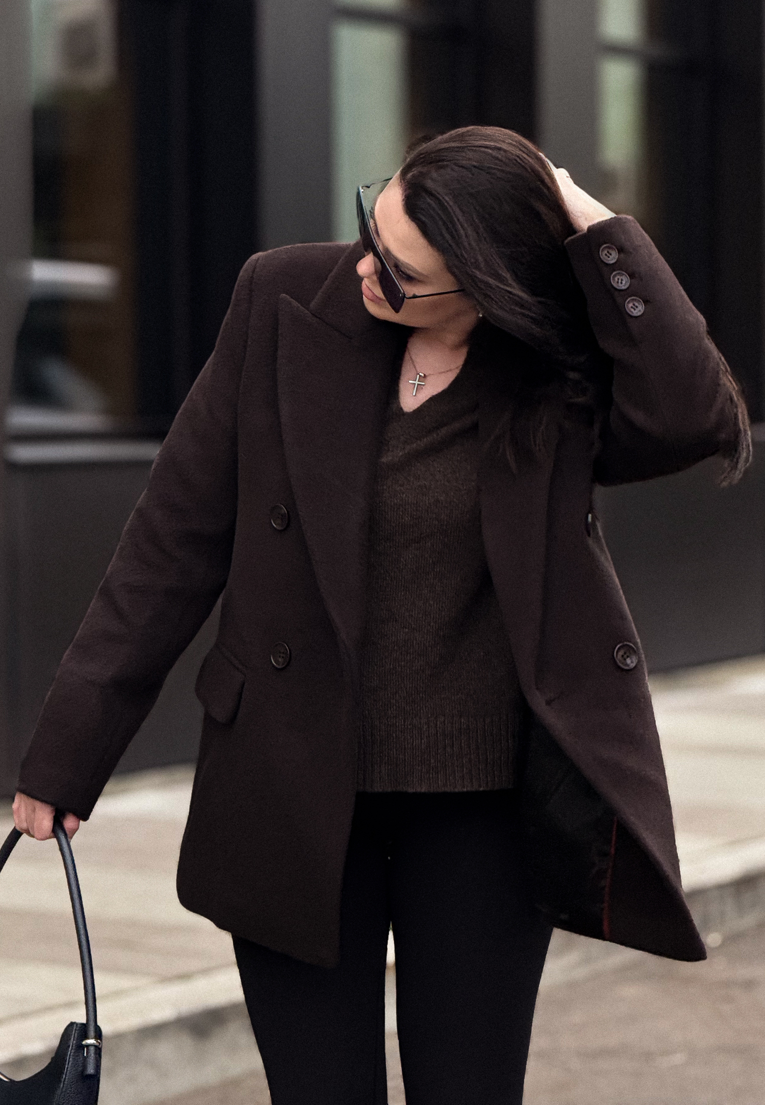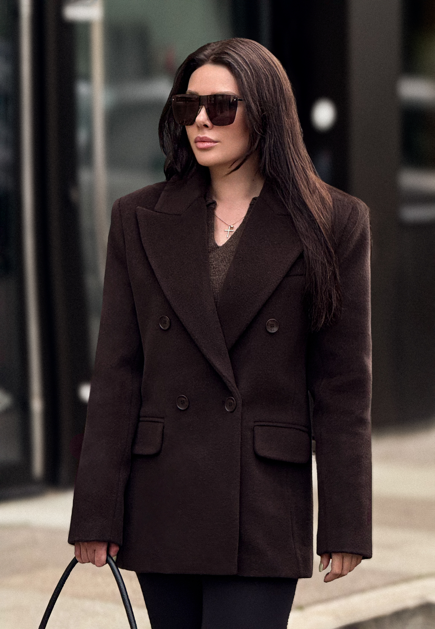 Полупальто La Sienna — воплощение сдержанной элегантности и современного кроя. Глубокий шоколадный оттенок без лишнего блеска легко сочетается с базовой палитрой гардероба, добавляя образу насыщенности. Плотная итальянская шерсть сохраняет тепло и остаётся лёгкой в носке, что делает модель универсальным выбором для прохладного сезона.