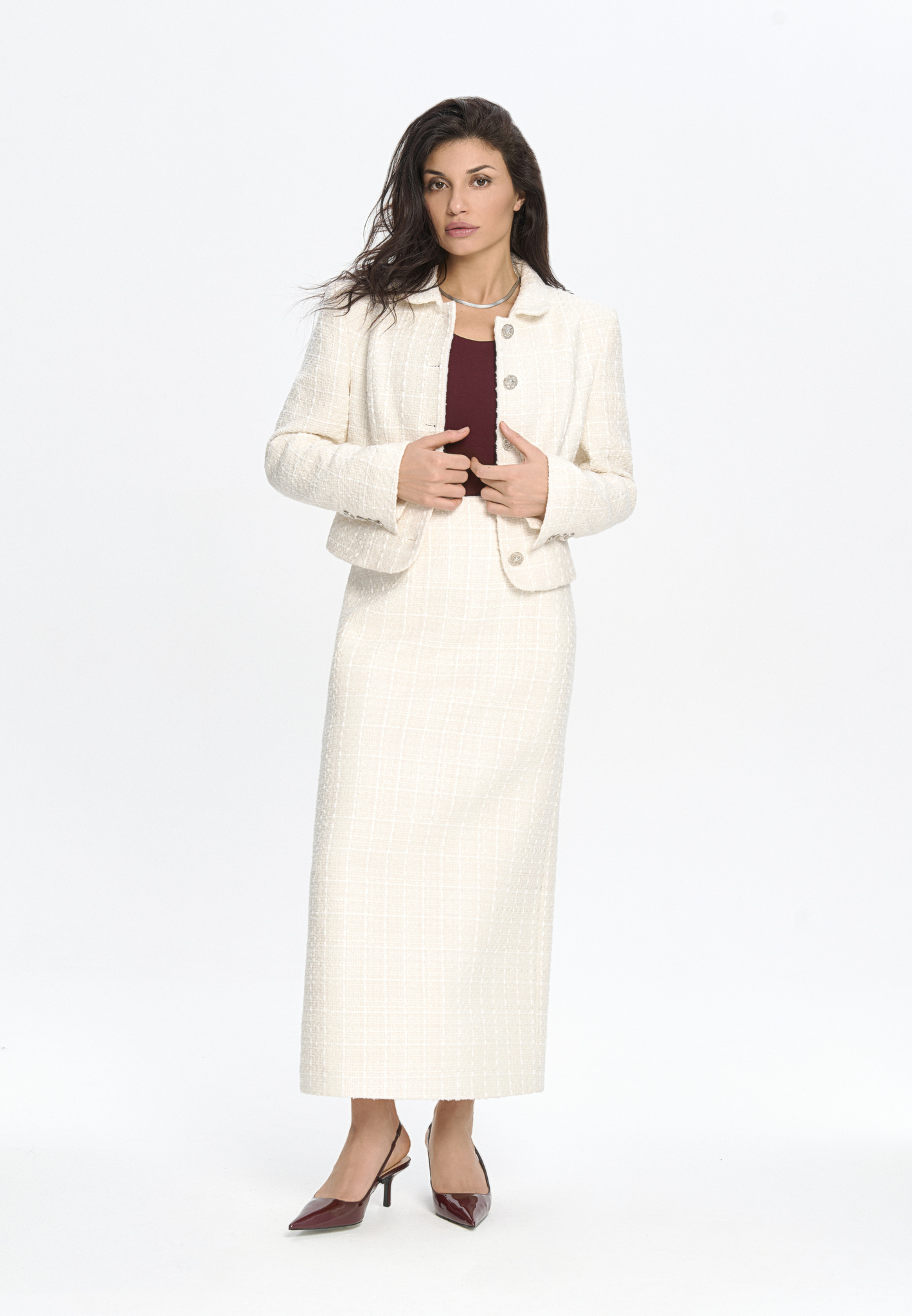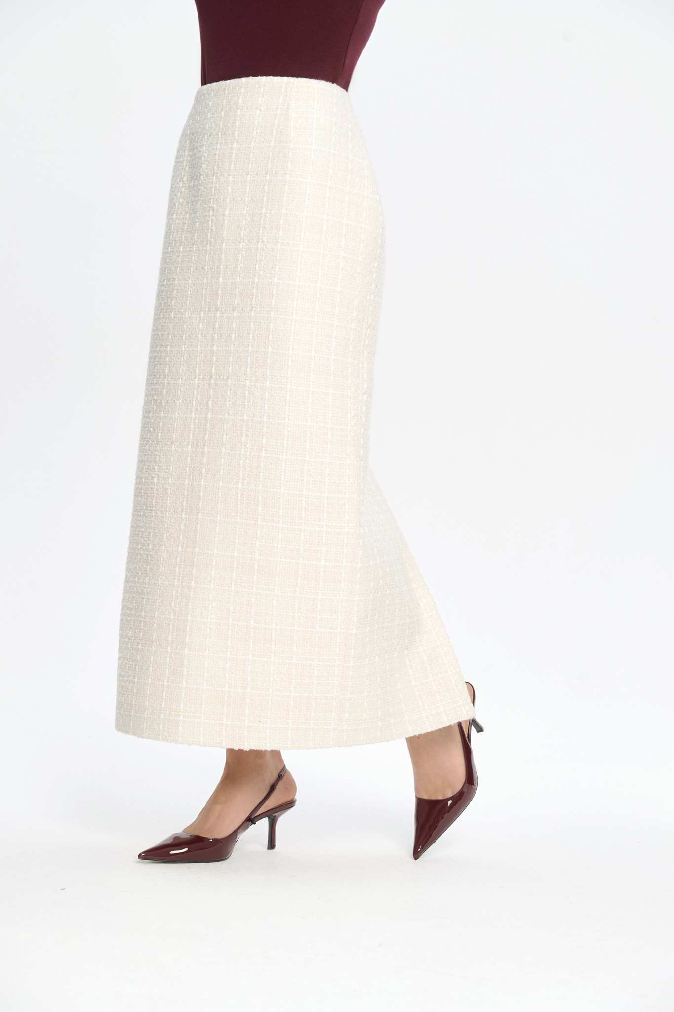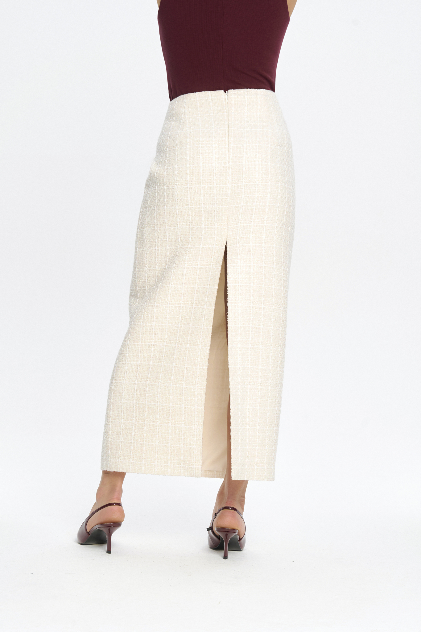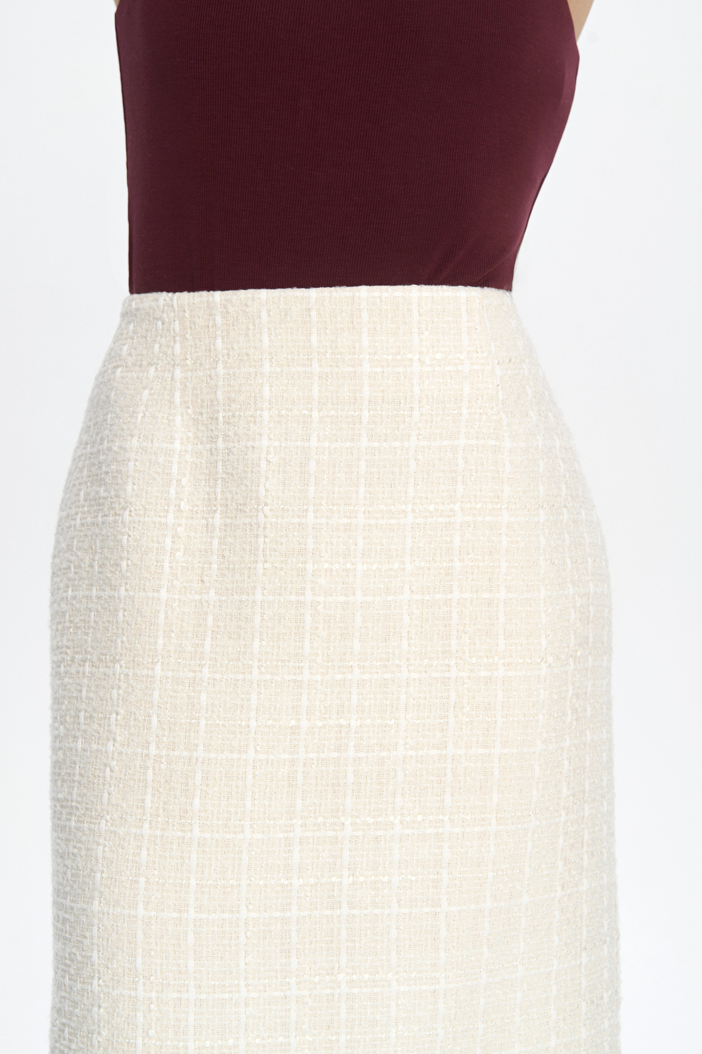 Юбка Céleste — воплощение утонченной элегантности и современного минимализма. Выполненная из легкого твида с нежным кремовым оттенком и тонким геометрическим узором, эта юбка создает образ, полный сдержанной роскоши.