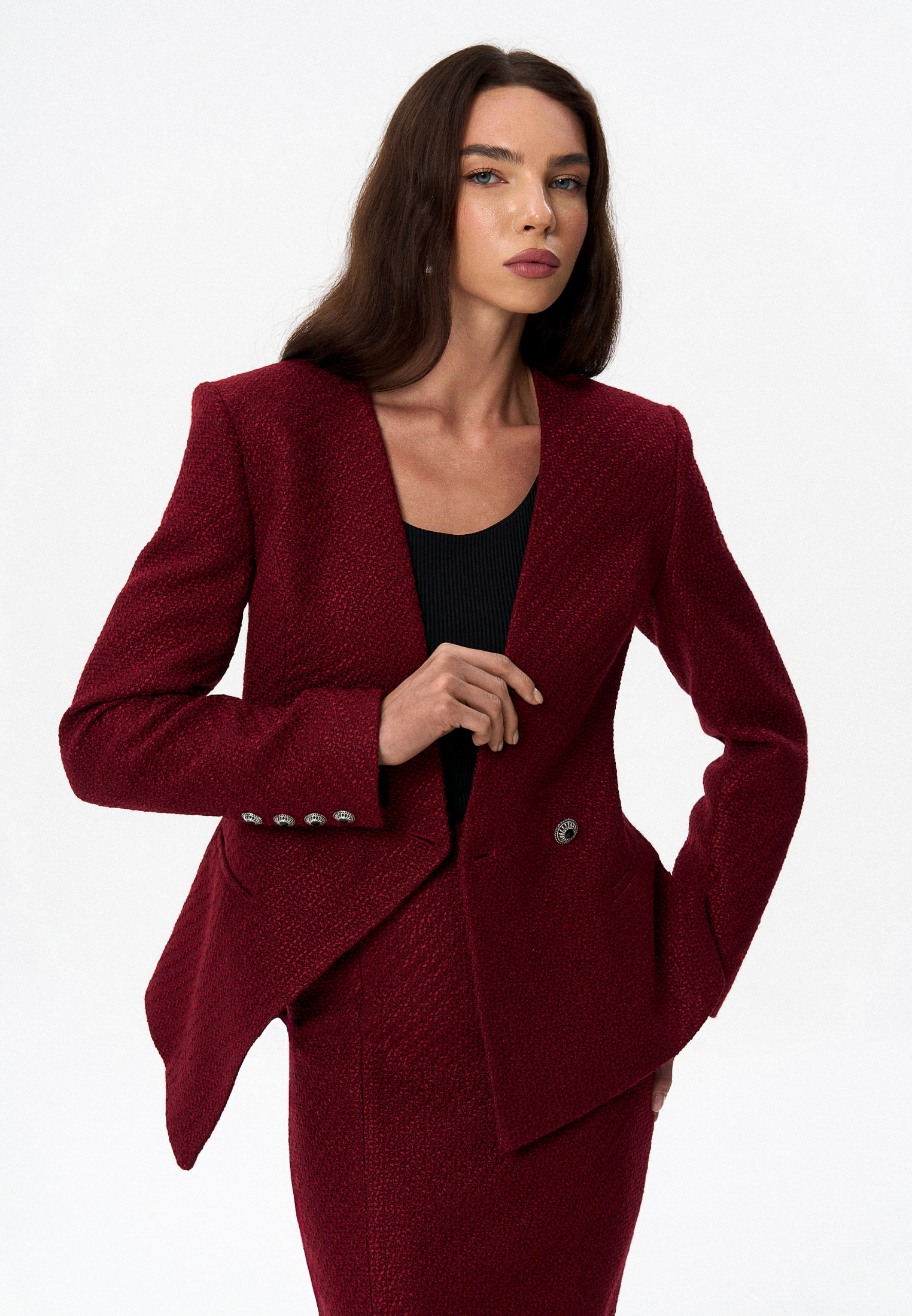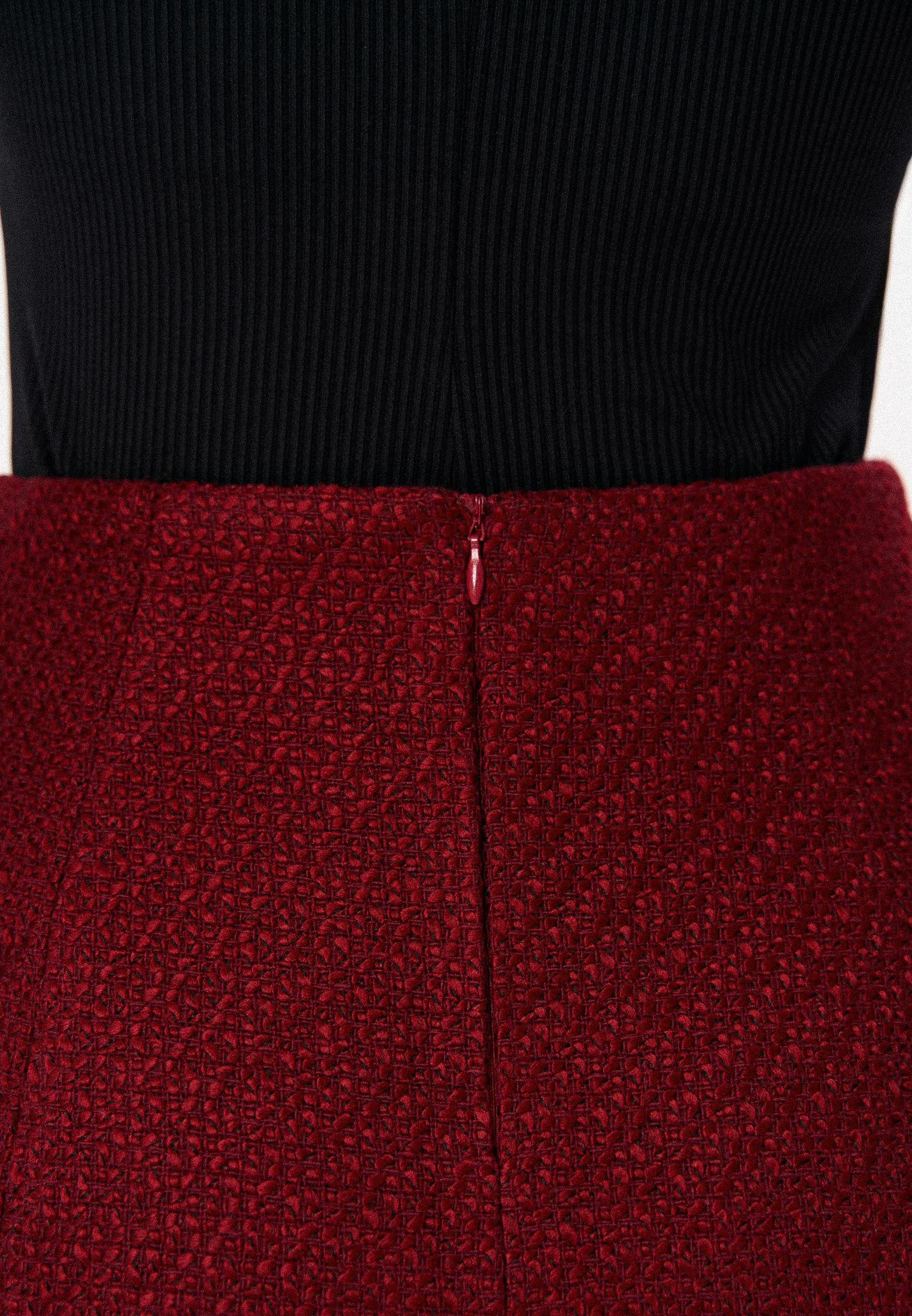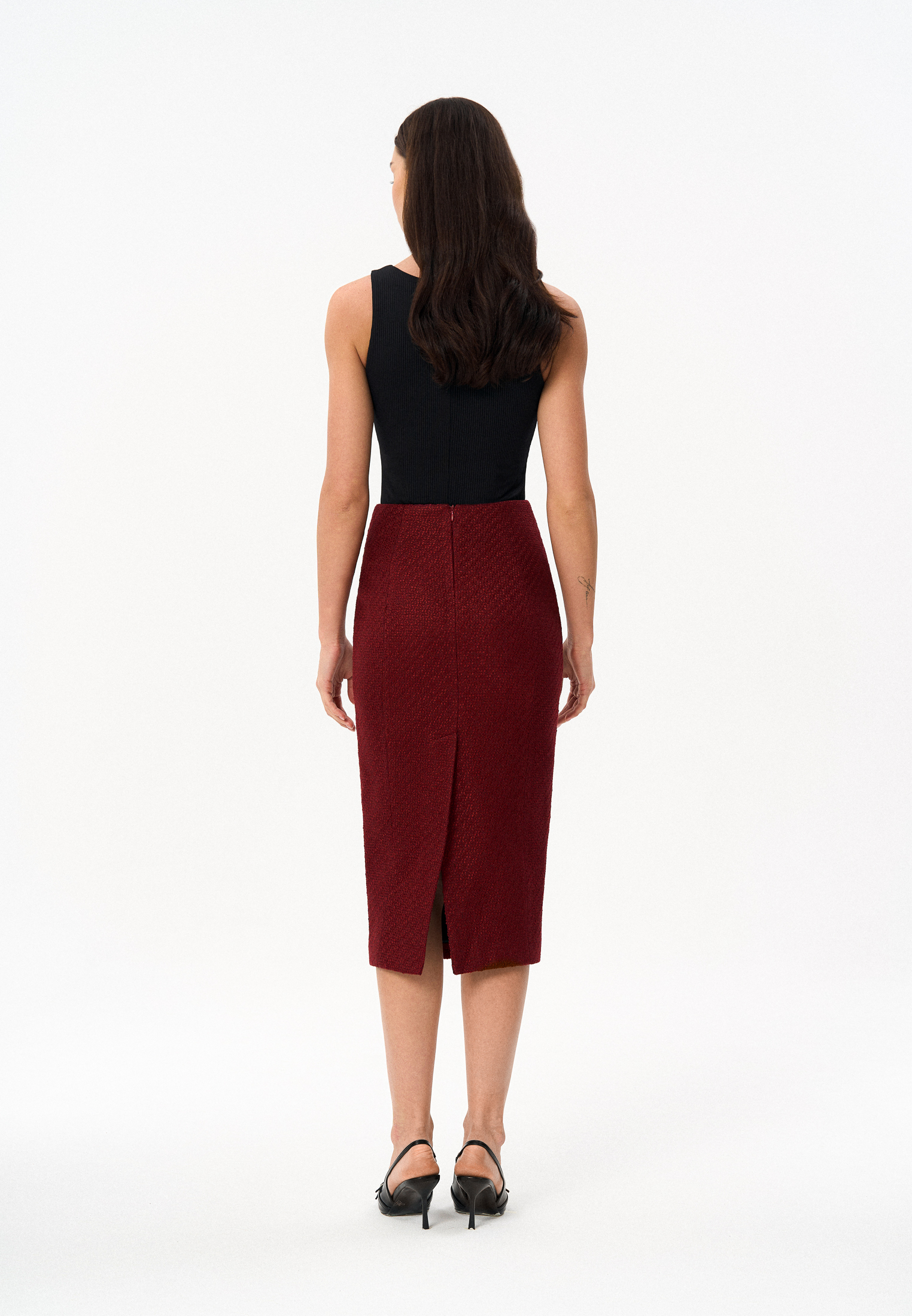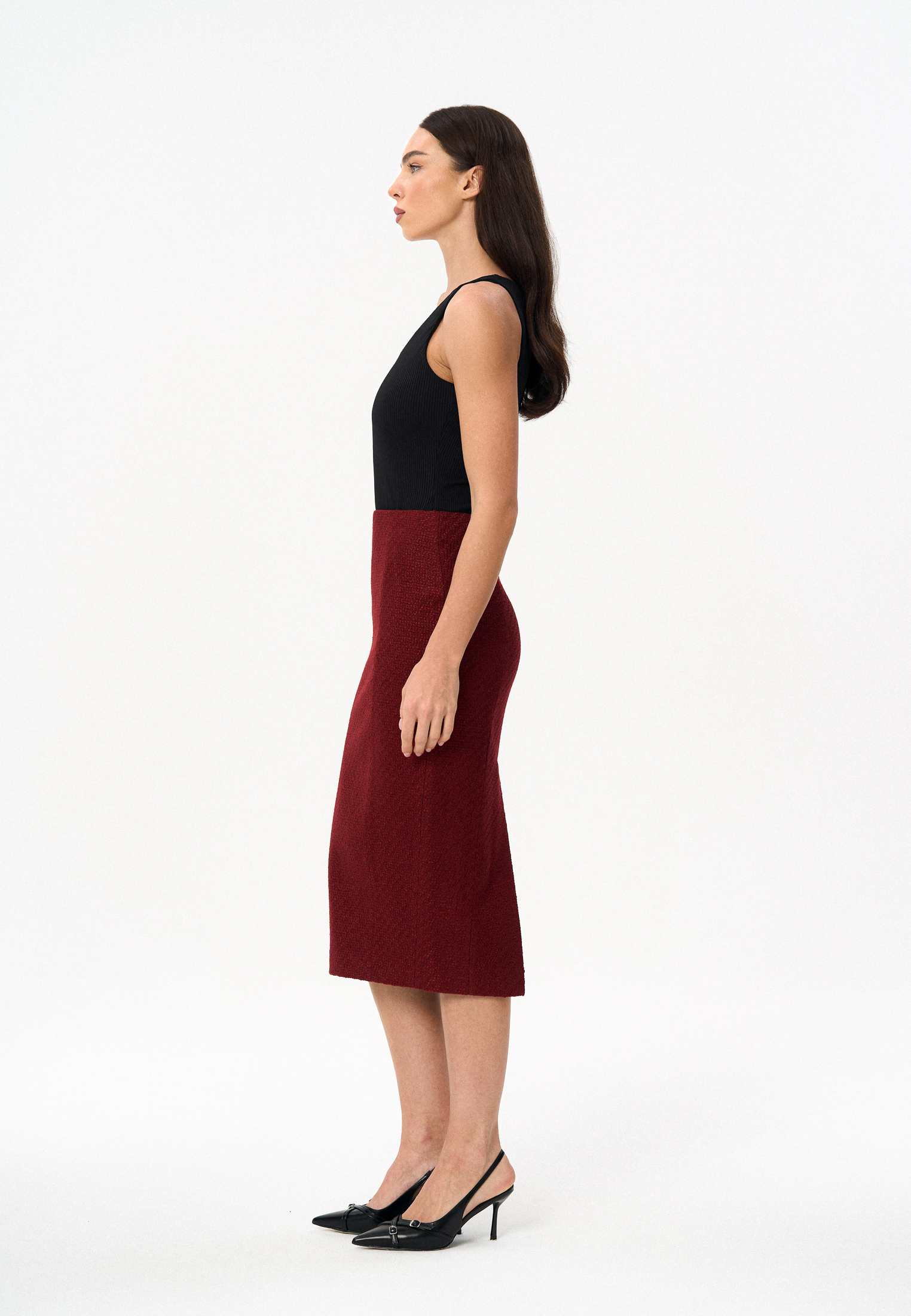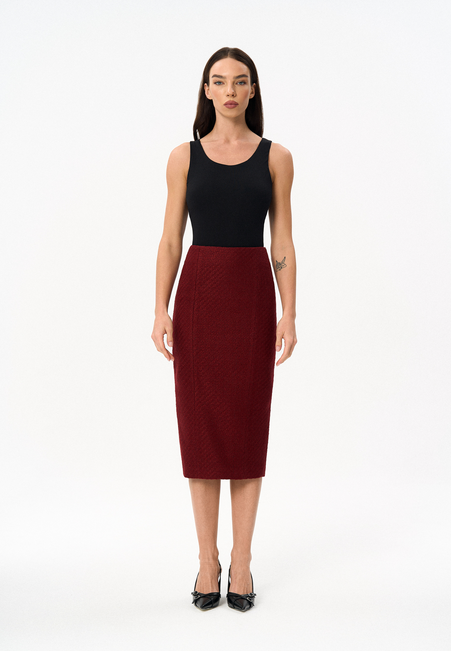 Бордовая юбка-карандаш миди из фактурного твида. Высокая посадка; прямой силуэт; потайная молния в среднем шве сзади; шлица по центру спинки для свободы шага; гладкая подкладка; без карманов и без пояса.