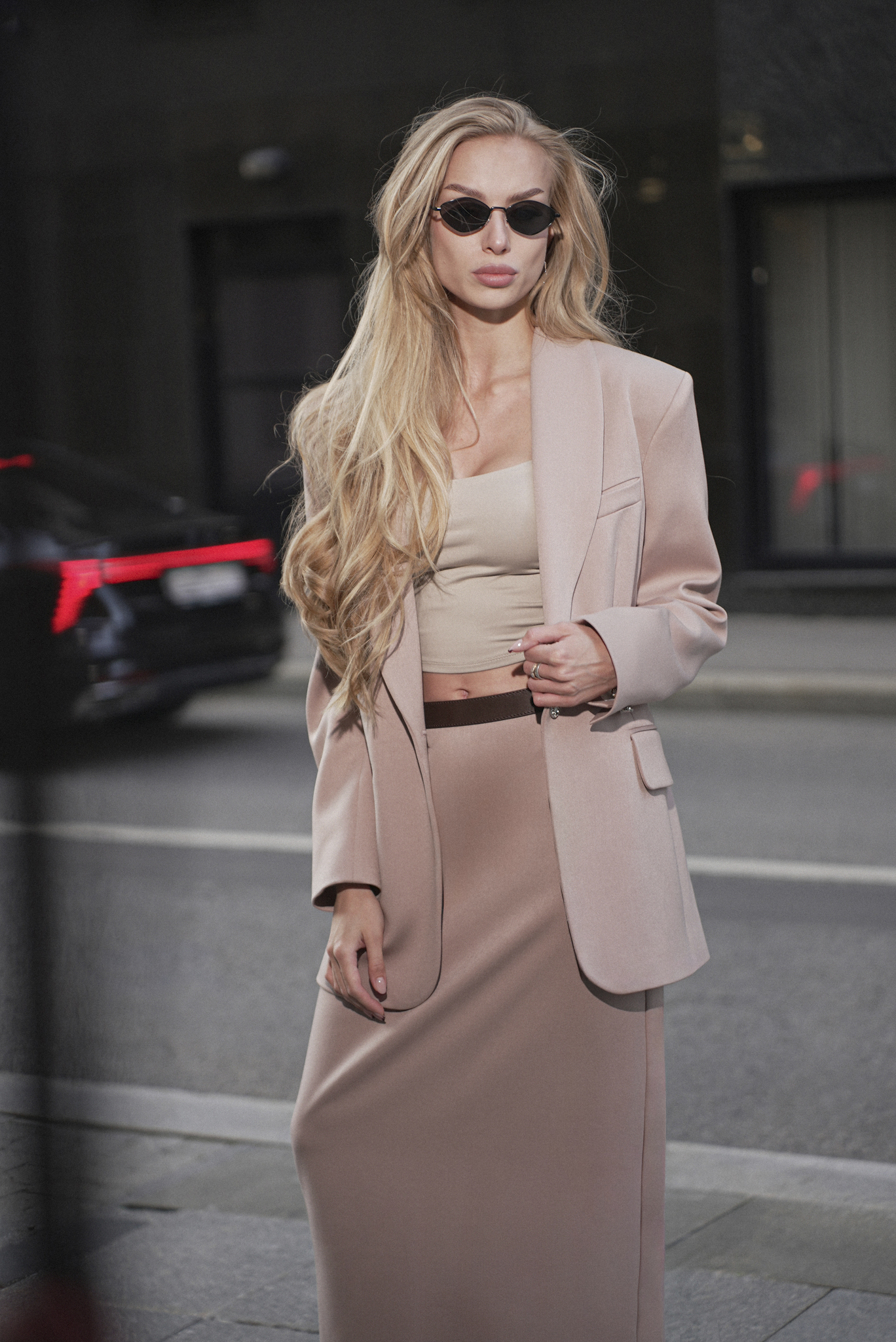 Жакет Palisséa выполнен в изысканном пепельно-бежевом оттенке — мягком и благородном, который подстраивается под свет и делает образ особенно утончённым. Архитектурный крой с чёткой линией плеча создаёт ощущение собранности и силы, а свободная посадка10 придает непринуждённость. Длинный лацкан и удлинённый силуэт визуально вытягивают фигуру, подчеркивая элегантность пропорций.